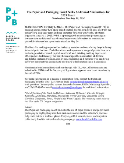 The Paper and Packaging Board Seeks Additional Nominations for 2025 Board